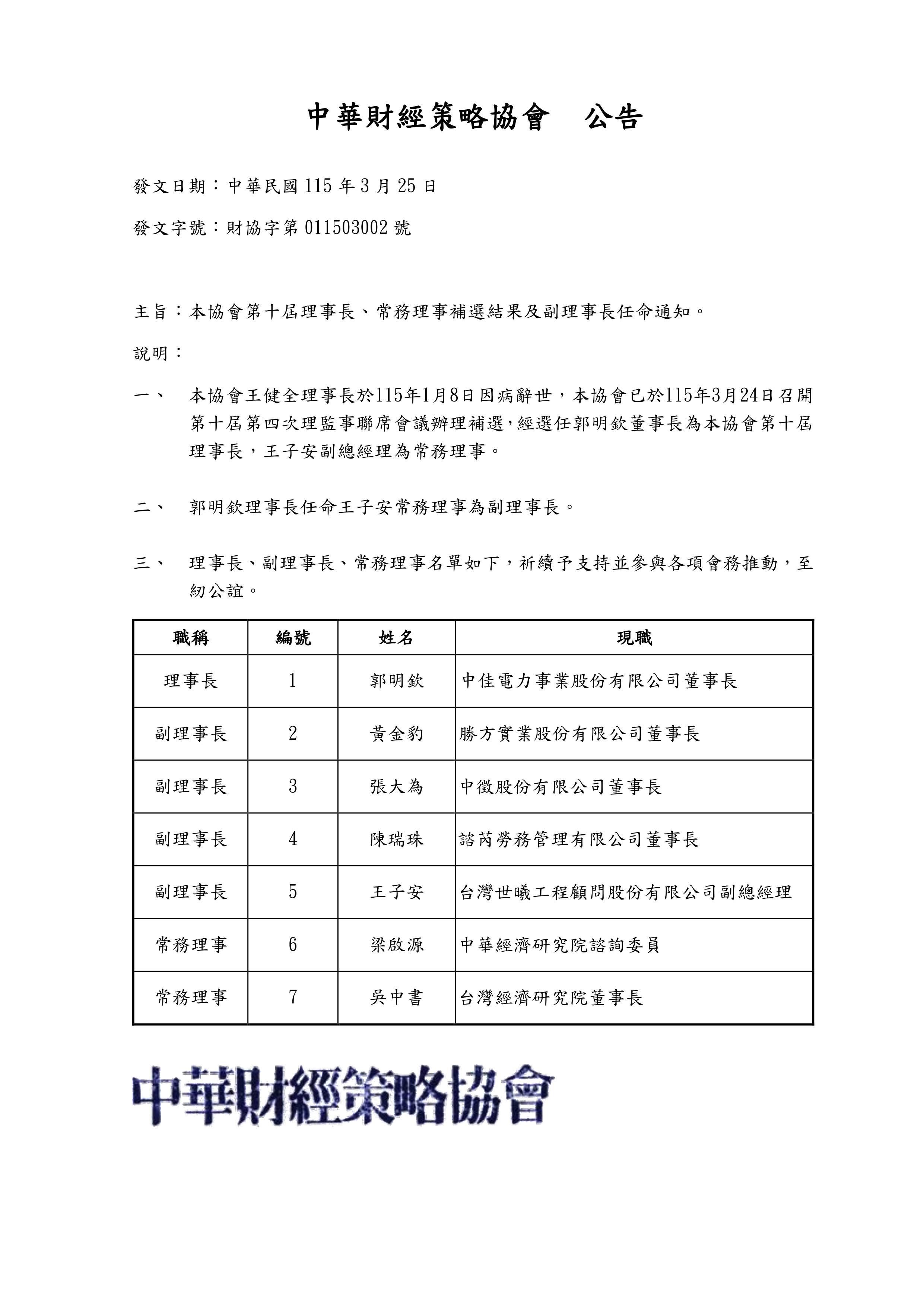【公告】第十屆理事長、常務理事補選結果及副理事長任命通知